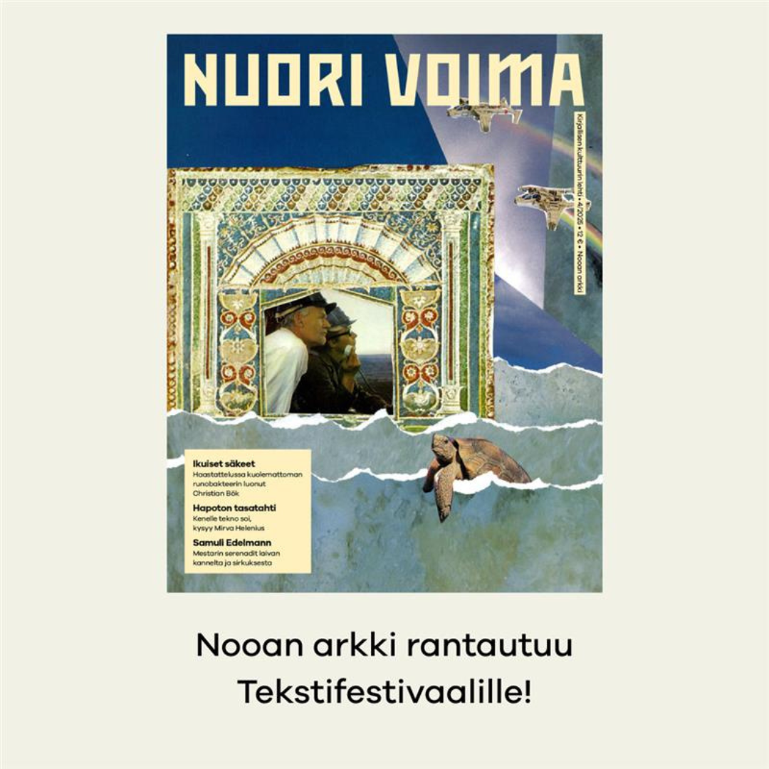 Nuoren Voiman julkkarit: Nooan arkki. Nuoren Voiman vuosi alkaa siitä, mihin edellinen päättyi, kun vietämme Nooan arkin (4/25) julkkareita Tekstifestivaalilla. Lavalla Kirjallisuuden jälkiviisaat Iida Sofia HirvonenAntti Hurskainen ja V. S. Luoma-aho sekä sukellus videopelien runousoppiin yhdessä Aura Siltalan ja Auli Särkiön kanssa.